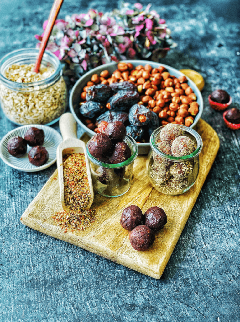 1. Die Dattel entkernen. Feigen, Aprikosen und Datteln klein schneiden und mit den Saaten, Zimt, Flohsamenschalen und in einer Schüssel vermischen.